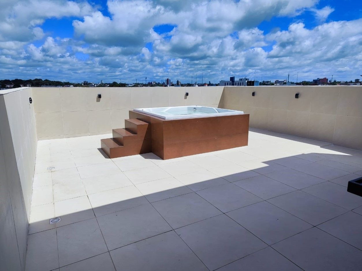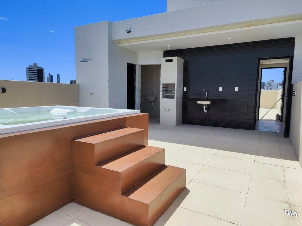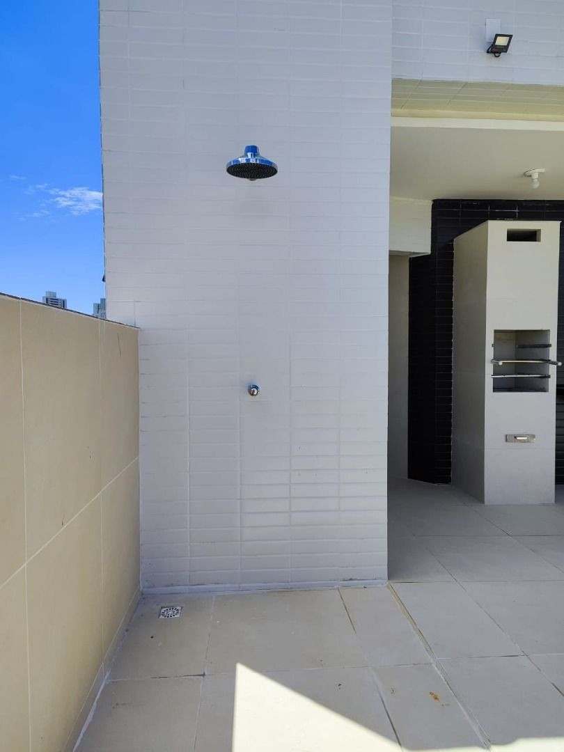 Cobertura Duplex com área de lazer privativa, hidro, churrasqueira, bancada gourmet, chuveirão, 02 suítes sendo 01 reversível, sala, cozinha, área de serviço localizada na área externa e 01 vaga de garagem. Apto com janelões em vidros refletidos, granito são marcos, cubas de sobrepor com bancadas em mármore travertino e acabamento em porcelanato.